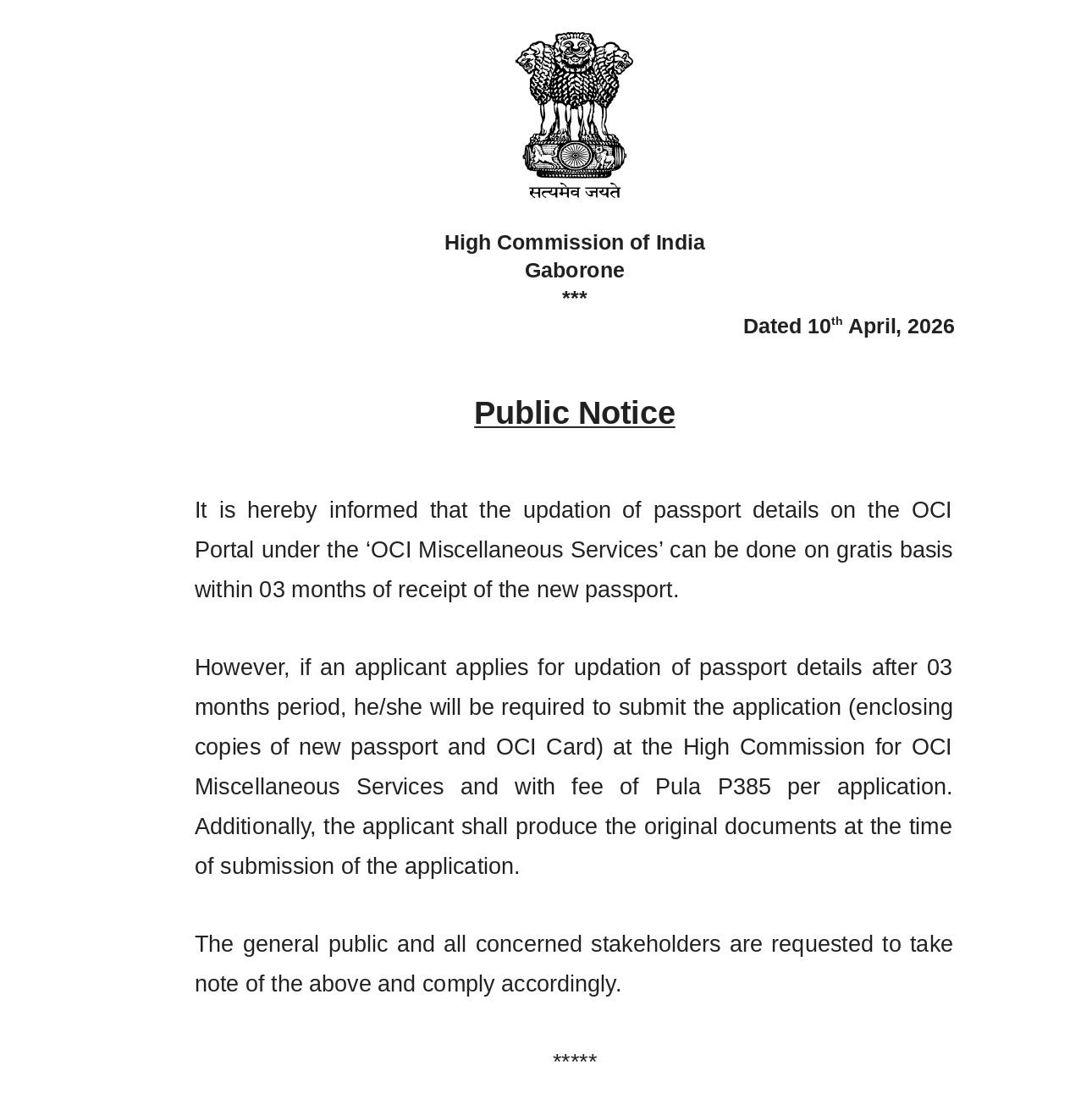 E-mail:Â com[dot]gaborone[at]mea[dot]gov[dot]in